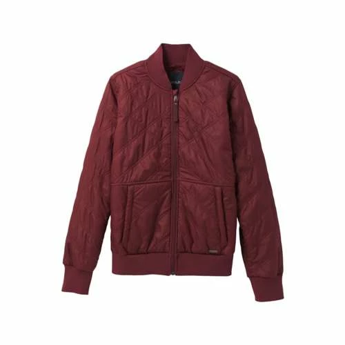 The prAna Esla Bomber Jacket for women Matte polyester shell fabric with PFC Free DWR (durable water repellent) quilted to recycled polyester chenille fleece lining. Design details of this relaxed fit jacket include a center front zip with ultra suede pull tab and rivet, a 2×2 rib knit collar, bottom hem and sleeve cuffs, zip entry hand pockets with brushed tricot lining, a hanger loop, and a recycled plastic bar logo. Dimensions: CB Length 23 3/4″