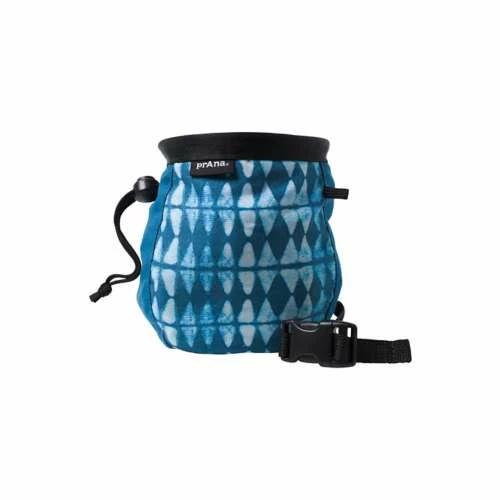 The prAna Roots Studio Chalk Bag is made from 100% recycled polyester. Design features of this microfiber chalk bag with belt include an adjustable drawcord closure, fleece lining, double belt loops for stability, elastic brush holder, and various front panel graphics. This is a Roots Studio and prAna co-lab.