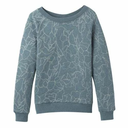 The prAna Carin Crew for women is made with a double-knit blend of organic cotton and recycled poly fabric. Design details include an abstract floral pattern print, a crew neckline, raglan sleeves, and a relaxed fit.