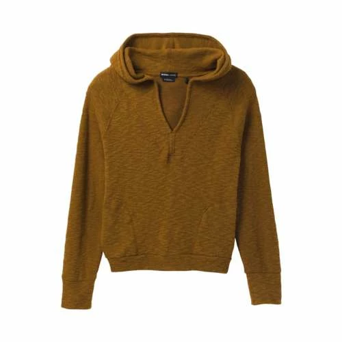 The prAna Frieda Hoodie for women is made from a recycled polyester/organic cotton stretch jersey fabric. Design details of this relaxed fit long sleeve pullover hoodie include raglan sleeves with cuff hem, on seam pockets, and a banded hem.