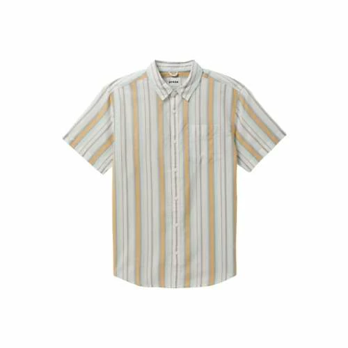 Organic cotton/ recycled polyester blend plain weave • Gravel/ Birch yarn dye stripe • Shoreline/ Sweet Grass/ Manzanita yarn dye plaid • Front left chest pocket • prAna woven label at left side seam • Faux corozo buttons