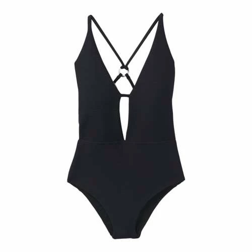 Recycled Ottoman, chlorine resistant, quick drying stretch fabrication. UPF 50+ Rated • Long triangle one piece with ring detail • Clean finish seaming • Front cut out detail • Dropped waistline • Open back, spaghetti strap detail with adjustable tie back closure • Recycled plastic ring detail • Removable soft cups • Minimum Coverage, High Leg, Cheekiest Seat Coverage