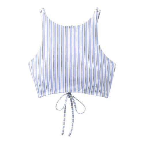 Performance chlorine resistant, quick drying stretch fabrication. UPF 50+ Rated • High neck top • Multi strap detailing • Adjustable shoulder straps • Tie back closure • Fully lined • Removable soft cups • Moderate Coverage, Moderate Support