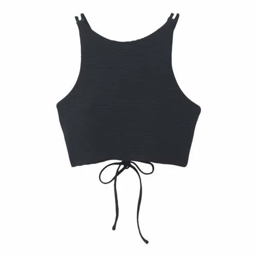 Recycled Ottoman, chlorine resistant, quick drying stretch fabrication. UPF 50+ Rated • High neck top • Multi strap detailing • Adjustable shoulder straps • Tie back closure • Fully lined • Removable soft cups • Max Coverage, Moderate Support